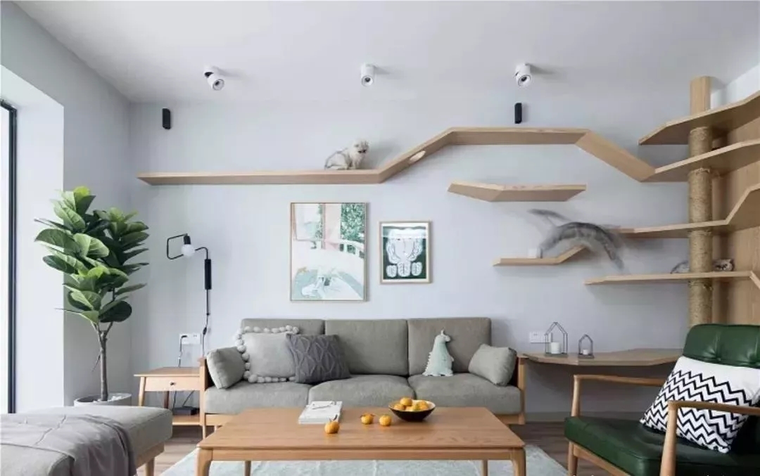 在我們從小寵物身上獲取安慰時(shí),也別忘了裝修時(shí),給他們留些自己的空間。比如養(yǎng)貓的家里可以在墻上裝一些板子,讓“貓主子”攀爬,還能起到裝飾墻面的作用。