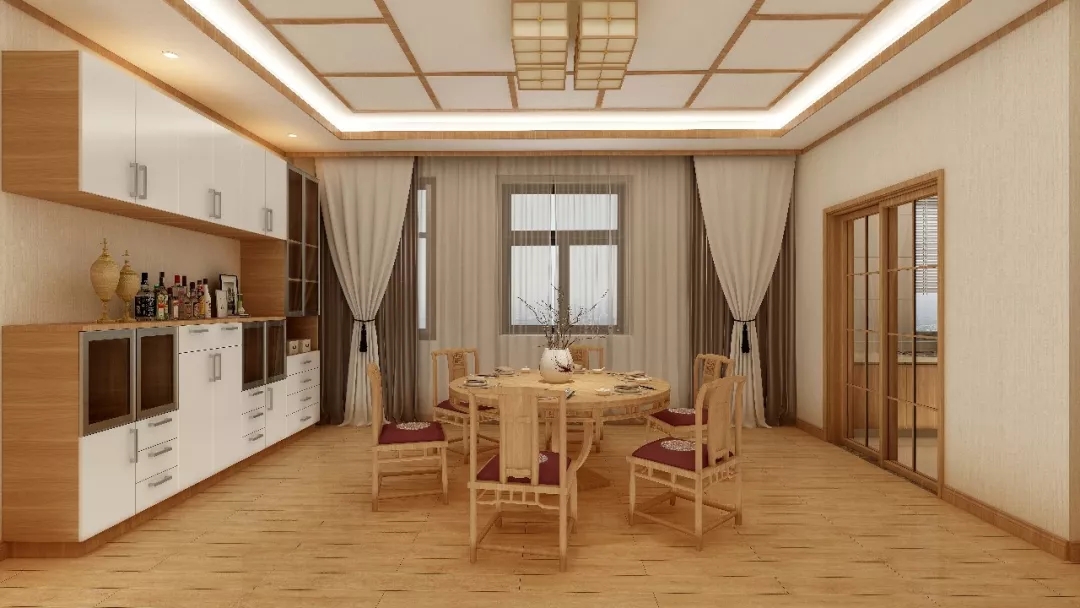 開放式客餐廳空間采光充分,搭配溫潤的原木色調(diào),形成暖意十足的家居氛圍。清爽的淺原木復(fù)合地板,依著室內(nèi)太多的同色調(diào)爬上房頂,大面積拼接,完好地裝飾出溫馨的小木屋質(zhì)感,十分得體。