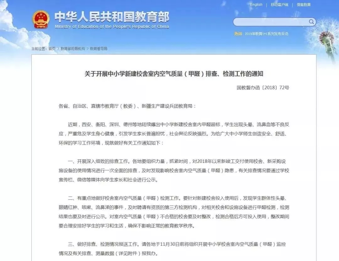 針對校園甲醛超標事件,2018年9月21日,國務(wù)院教育督導委員會辦公室下發(fā)了《關(guān)于開展中小學新建校舍室內(nèi)空氣質(zhì)量(甲醛)排查、檢測工作的通知》,通知要求: