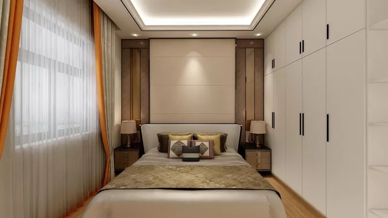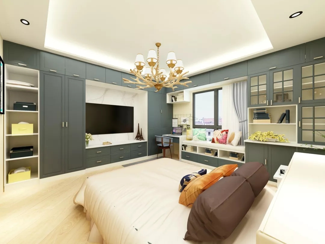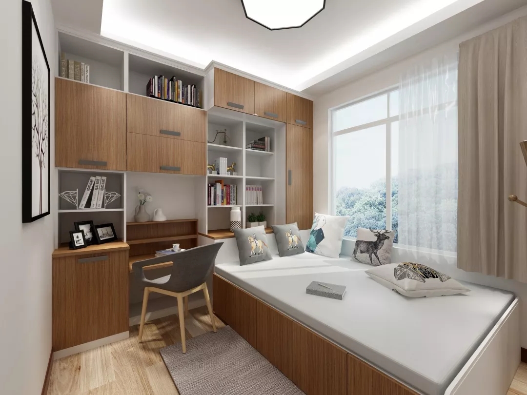 如果臥室稍微大點(diǎn),可以擺下獨(dú)立的衣柜,而且是擺在床尾位置,正好又需要電視柜或書桌等功能的,那么就可以把書桌或電視柜與衣柜組合起來設(shè)計(jì),在小小的臥室里實(shí)現(xiàn)更多的功能。