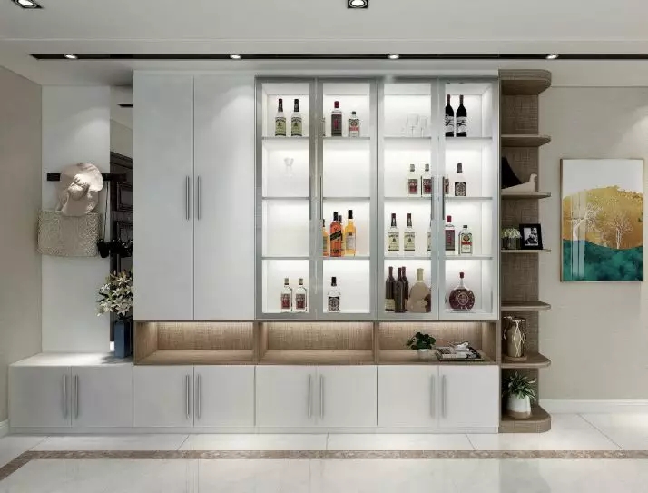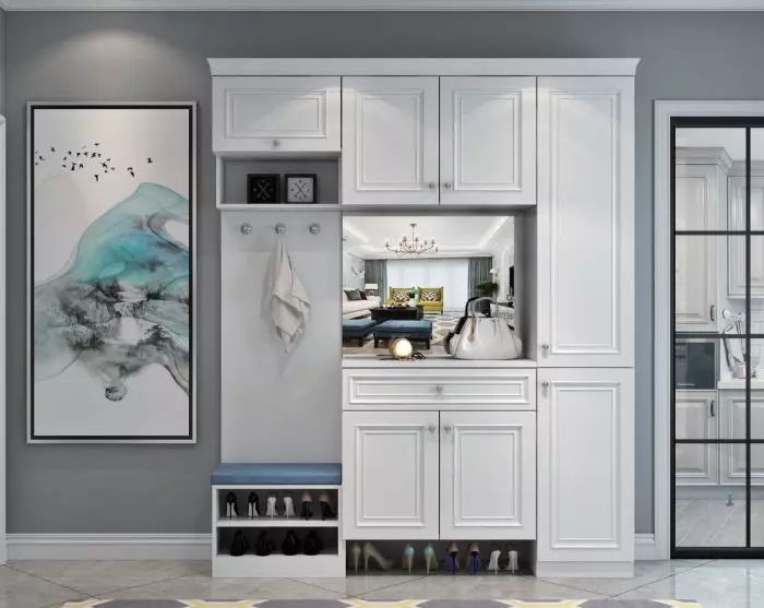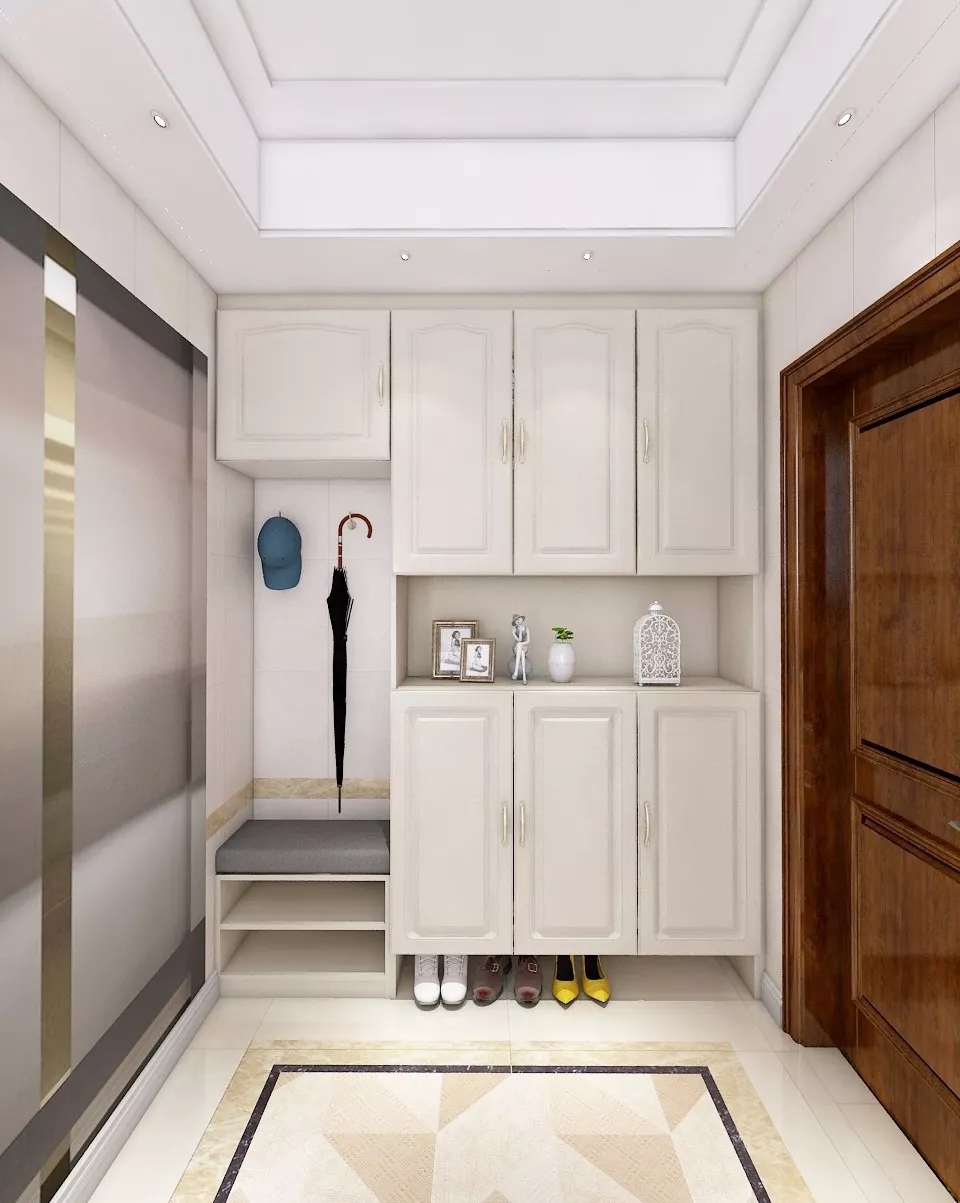 嵌入式柜一般是和進(jìn)門吊頂結(jié)合設(shè)計(jì)的,不僅美觀實(shí)用而且可以大大節(jié)省室內(nèi)空間。利用墻面的空間,在考慮墻體的承重范圍下,在玄關(guān)處設(shè)計(jì)嵌入式柜,能夠保證足夠安全。