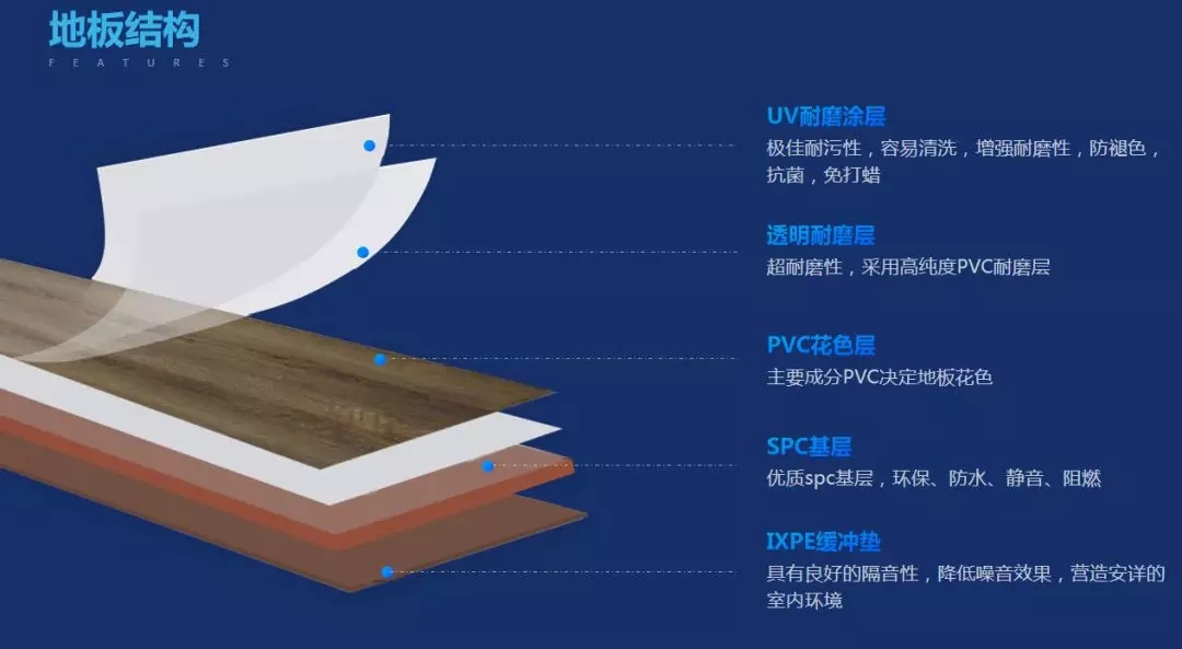 SPC地板的結(jié)構(gòu):由底到面依次由緩沖墊,spc基層,pvc花色層,透明耐磨層與UV耐磨涂層構(gòu)成。