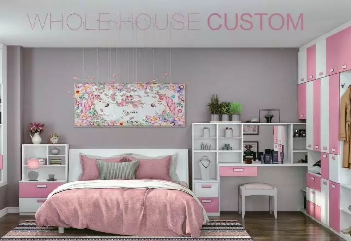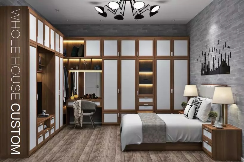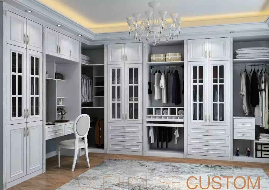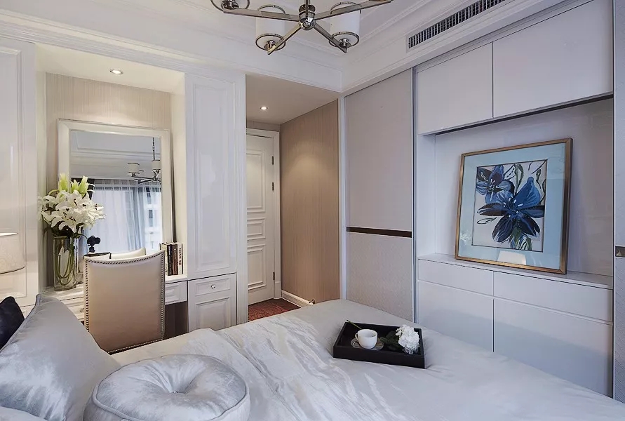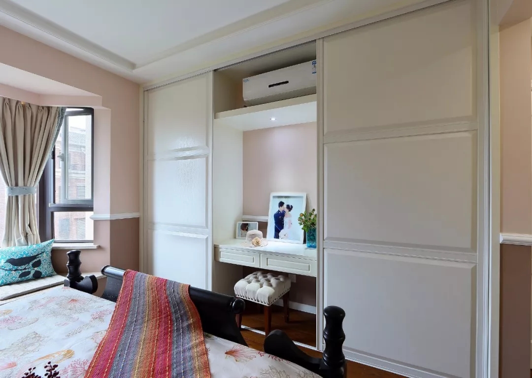 如果定制柜不能與梳妝臺練成一條線,但是書桌或梳妝臺是與柜體交錯布置的情況下,那么在定制柜體的時候,也可以挨著定制上一個書桌或梳妝臺,這樣衣柜成的空間就可以利用起來,提供更加靈活方便的收納與擺置位置。