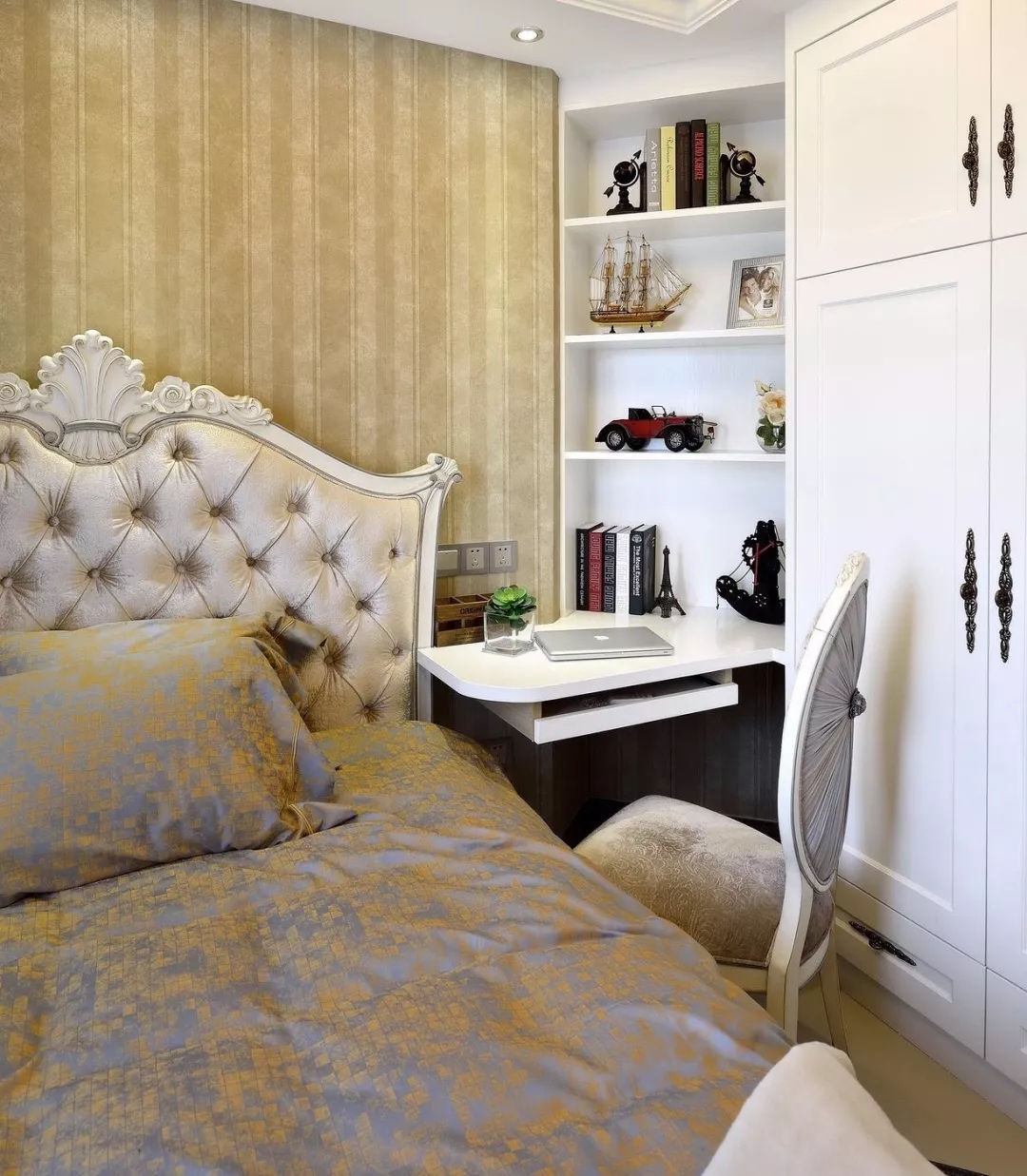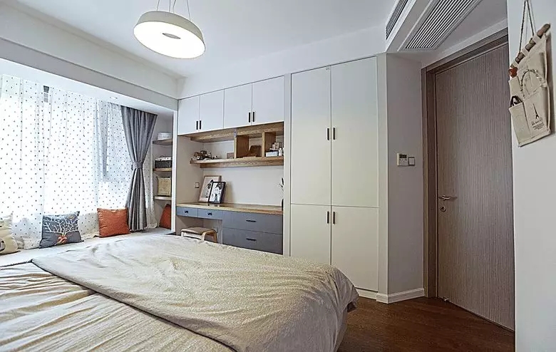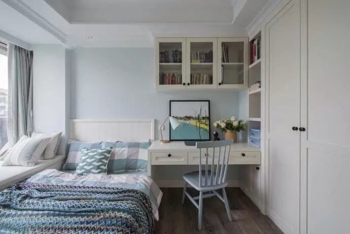 臥室里除了睡覺的床鋪,往往還需要添設(shè)上衣柜、書桌或梳妝臺,但在有限的空間里,巧妙地利用布置、利用好每一厘米的設(shè)計,就顯得格外的重要了!而臥室的衣柜多數(shù)人家都是選擇定制的,這個時候如果能把書桌、梳妝臺與衣柜結(jié)合一起,那么整體空間利用就更全面了!