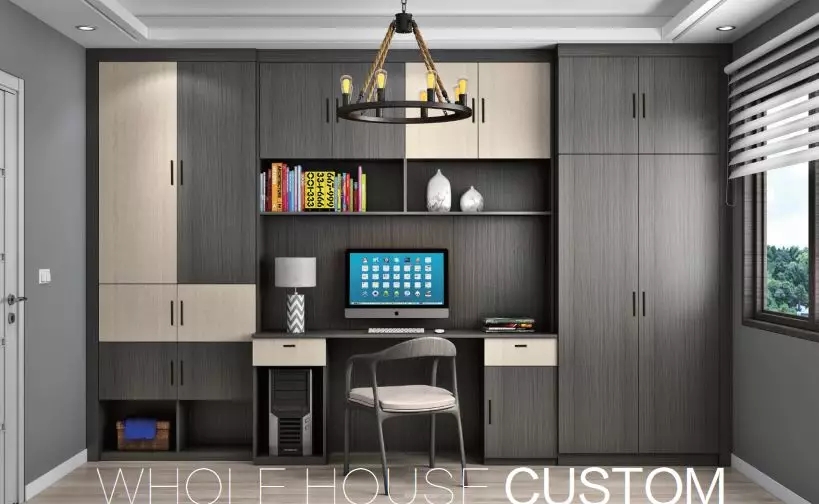 如果整體定制柜體的墻面比較長,或則裝完書桌或梳妝臺后還有剩余的空間,那么久可以把桌面與定制柜練成一體,保持空間的簡潔,同時也是非常的實用華麗。