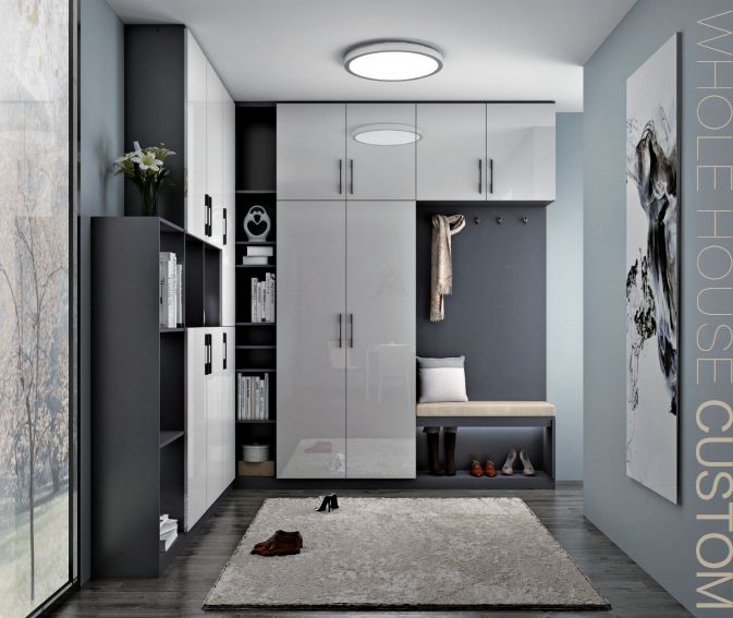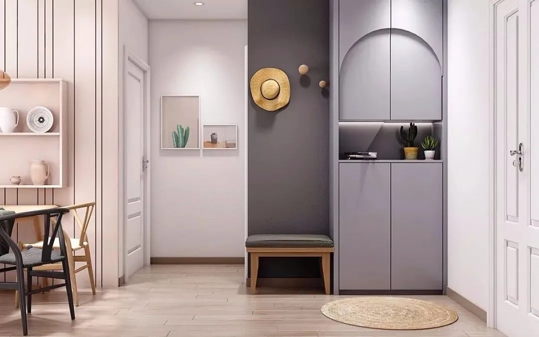 鞋柜中部或側(cè)面可以留空,用于放置包包、鑰匙、雨傘等小件物品,以及干凈的口罩、酒精、等消毒物質(zhì)。