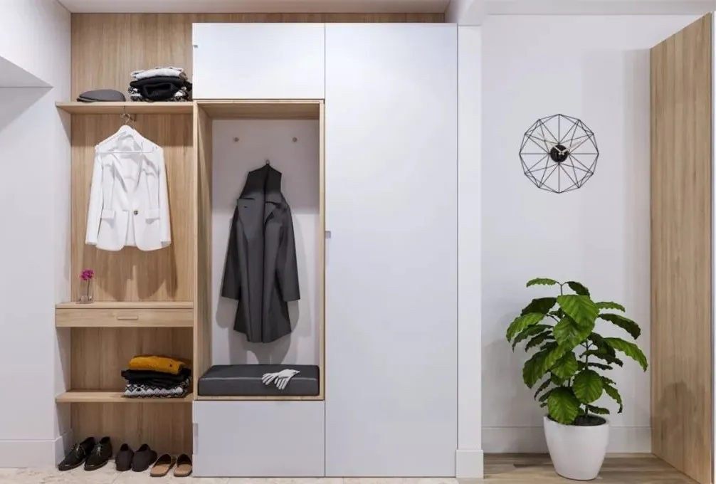 外出穿的衣物一般建議在門(mén)廳就脫掉,這樣預(yù)留一面掛衣墻必不可少,如果位置空間大掛衣區(qū)可內(nèi)嵌于鞋柜中,下面設(shè)置換鞋凳。美觀又實(shí)用。