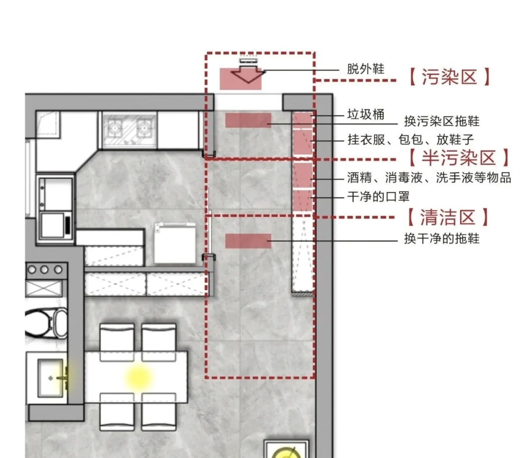 通過(guò)以上調(diào)查,結(jié)合當(dāng)前疫情環(huán)境,為了長(zhǎng)期的生活居住健康安全,說(shuō)明我們對(duì)玄關(guān)這個(gè)設(shè)計(jì)應(yīng)該多加一項(xiàng)功能,不僅僅是風(fēng)水,好看,它的功能性需求更為重要??赏ㄟ^(guò)分成【污染區(qū)】、【半污染區(qū)】、【清潔區(qū)】三個(gè)區(qū)域,實(shí)現(xiàn)美觀的同時(shí)并隔絕從外頭攜帶回的病菌。