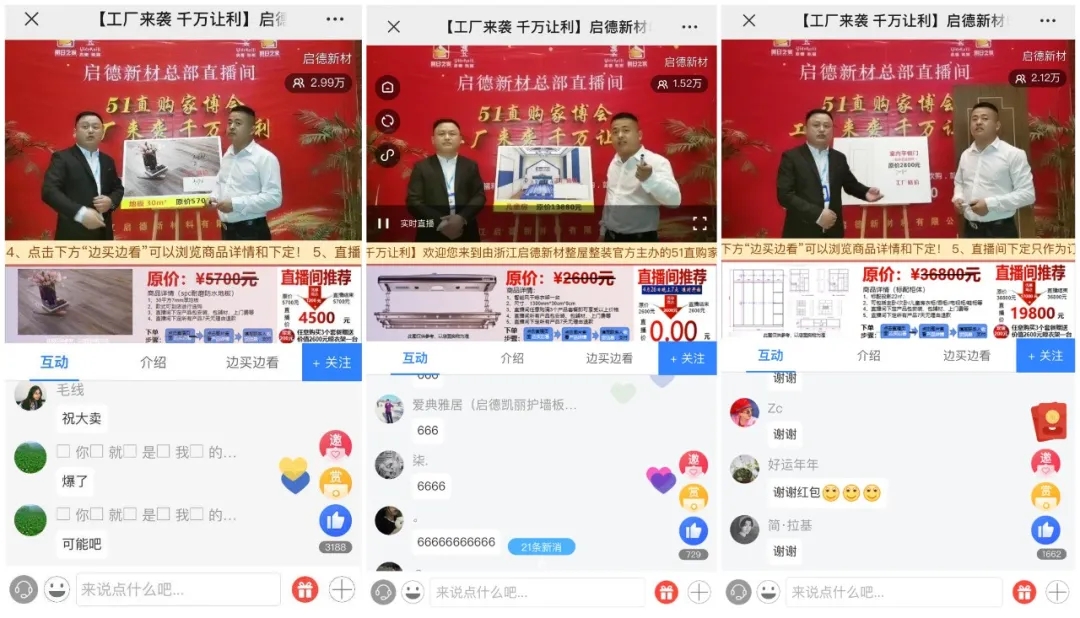 除了這些優(yōu)惠外,直播間內(nèi)價(jià)值2600元的智能晾衣架免費(fèi)送、到店紅包禮、9.9元搶購(gòu)1000元代金劵、到店砸金蛋等不斷出現(xiàn),掀起一波又一波的“啟德666”刷屏!以及海量紅包雨不間斷驚喜降臨,大大刺激了潛在消費(fèi)者的購(gòu)買欲望,提高了直播間的活躍度和轉(zhuǎn)化率,粉絲們爭(zhēng)先搶貨,一度點(diǎn)燃直播間火爆氛圍。