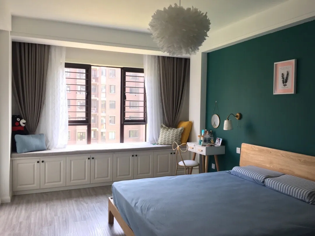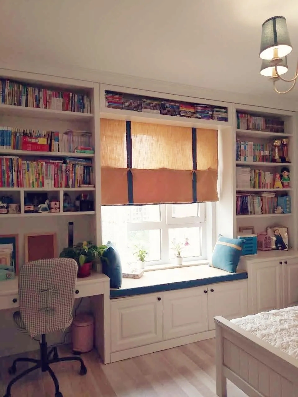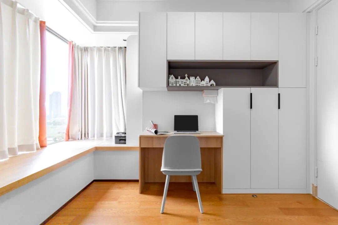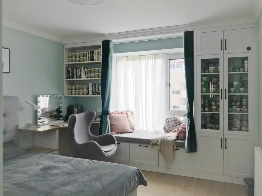 在沒有飄窗的戶型中,如果窗戶旁邊的空間又是比較寬裕的,就可以在靠窗位置裝上一排的飄窗,然后把飄窗兩側的空間也做成收納柜利用起來。這樣靠窗也能安裝定制柜,還不會讓柜子遮擋窗戶、影響空間的采光與通風。