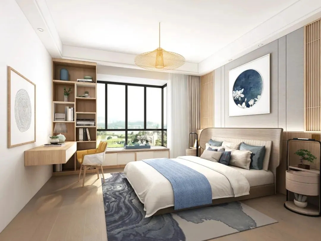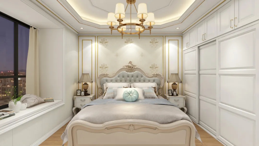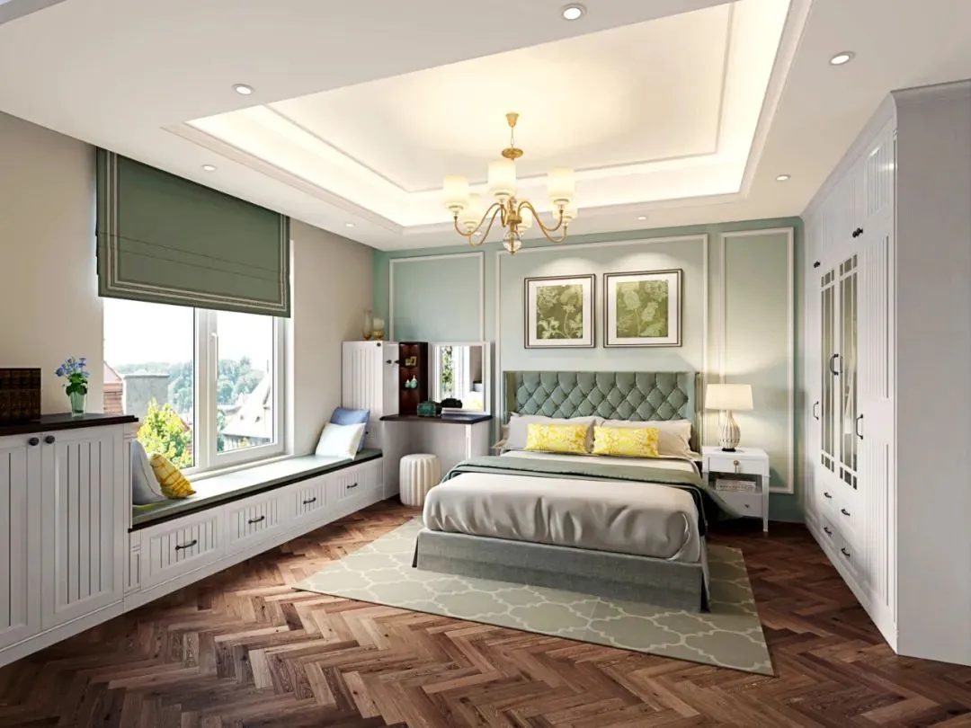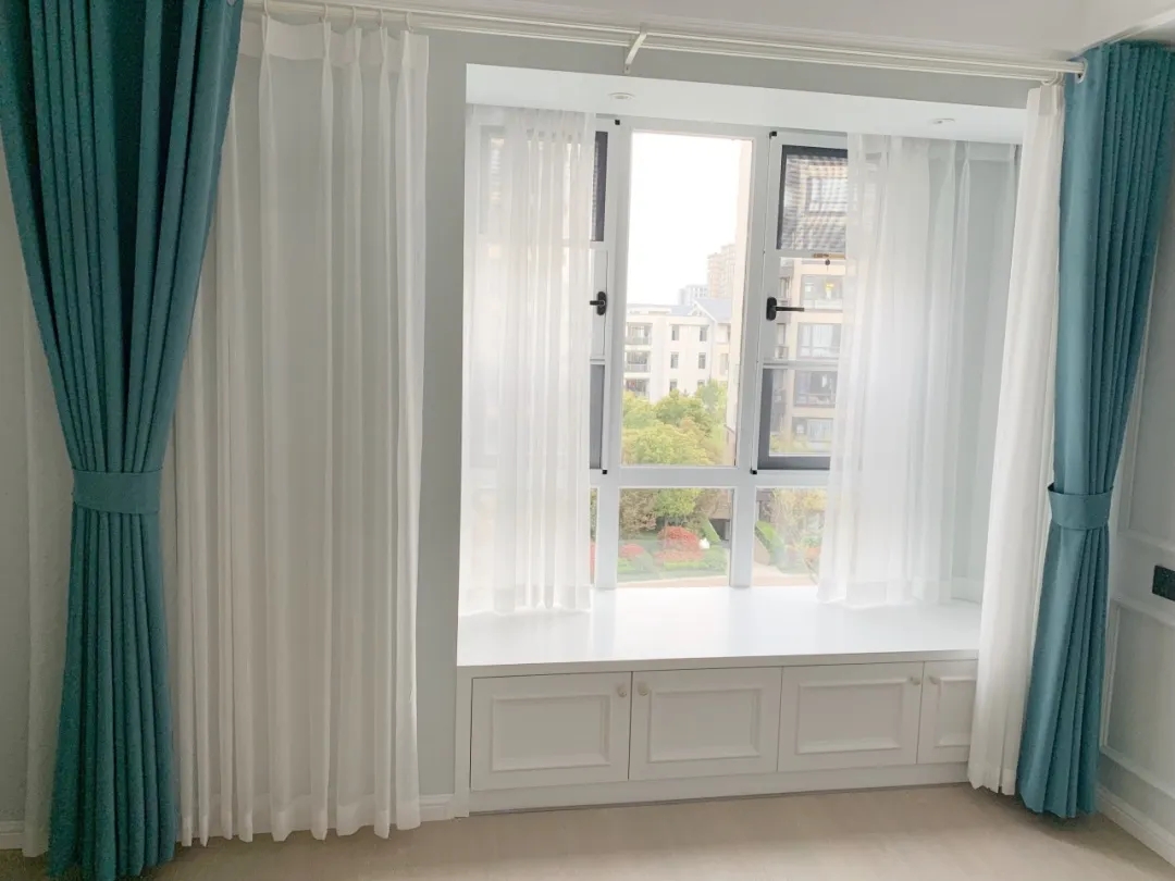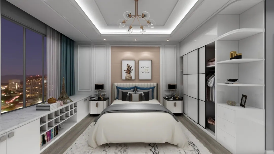 在沒有飄窗的戶型中,如果窗戶旁邊的空間又是比較寬裕的,就可以在靠窗位置裝上一排的飄窗,然后把飄窗兩側的空間也做成收納柜利用起來。這樣靠窗也能安裝定制柜,還不會讓柜子遮擋窗戶、影響空間的采光與通風。