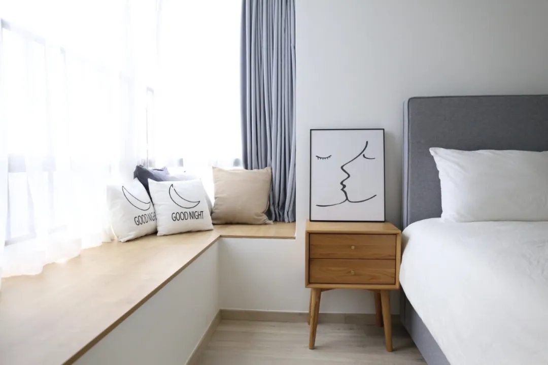 戶型的窗戶外凸,窗戶與兩側的墻體有個凹位,這樣就可以平著窗戶兩側的墻體,裝上一個飄窗收納柜,讓空間的每一個角落都得到到位的利用,為小戶型提供更加充裕的儲物收納空間。