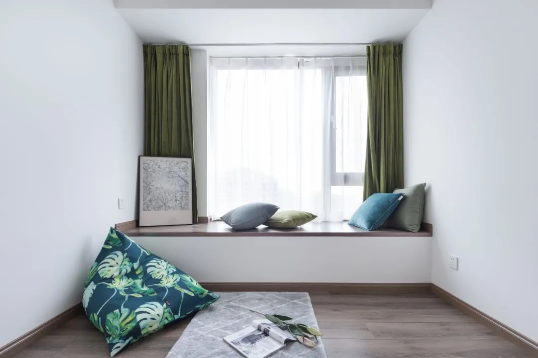L形的飄窗整體窗戶采光面積更大,可以把飄窗臺面換成木質的,這樣無需布藝坐墊,也能有著舒適自然的坐席位置,享受著自然與陽光的洗禮,讓居家時光溫馨而又愜意。