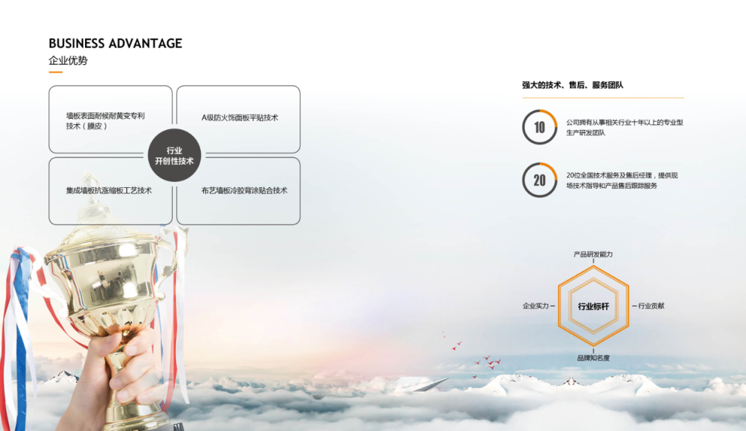 公司全面通過了ISO9001質(zhì)量管理體系認證和ISO14001國際環(huán)境管理體系認證,擔任中國建材協(xié)會集成墻面分會常務副會長職務。參與了住建部《中國集成墻面行業(yè)標準》的編制工作,并獲得“中國質(zhì)量AAA級企業(yè)”、“中國著名品牌”、“建筑應用創(chuàng)新大獎”等榮譽稱號。致力家裝“0”污染,輔材嚴格執(zhí)行歐洲環(huán)保標準。先后獲得國家設計專利70余項,產(chǎn)品深受廣大客戶的青睞和喜愛。